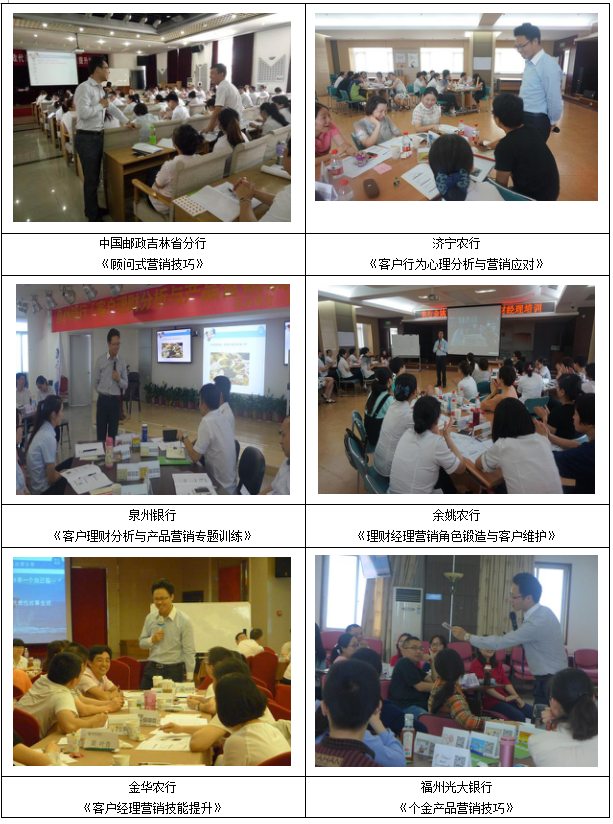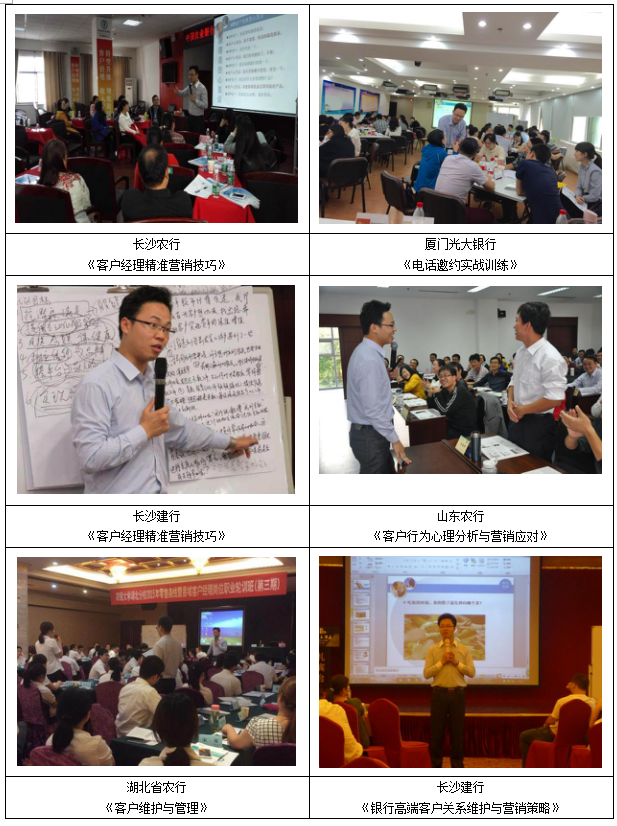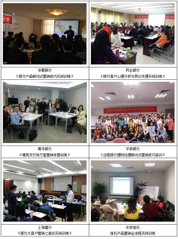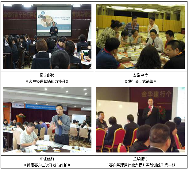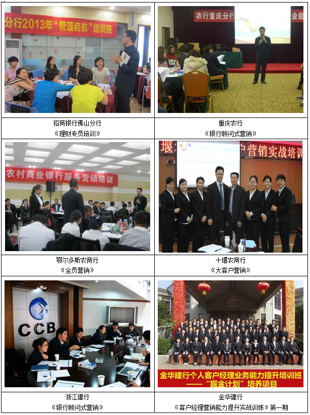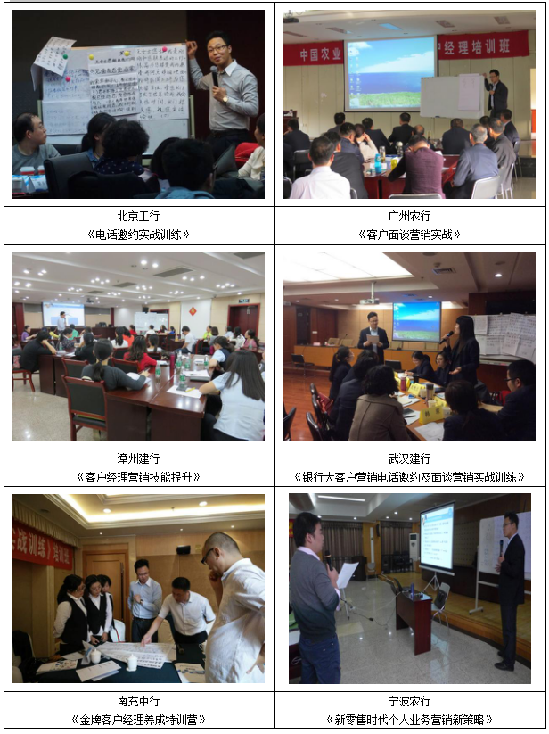 在银行体系实施一系列大型客户经理销售能力与客户维护能力训练项目,“培—训—跟”项目化服务银行区域涵盖14省3市;