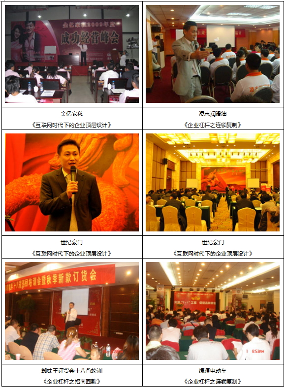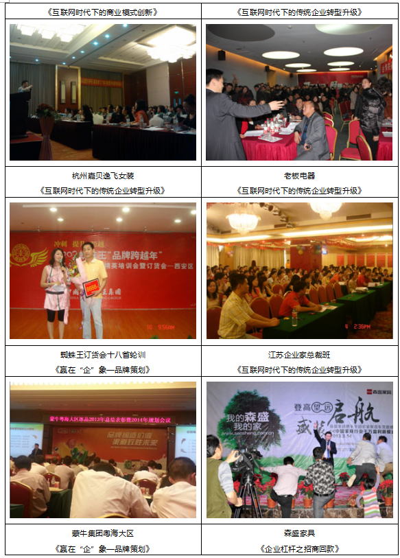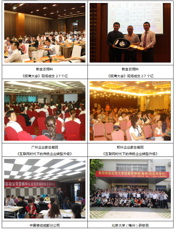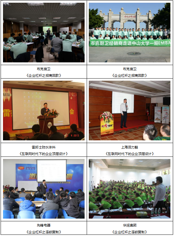 总裁班课:互联网时代下的企业顶层设计、企业杠杆之连锁复制、企业杠杆之招商回款、微利时代企业如何实现利润倍增、赢在“企”象—品牌策划、资源整合—赢定天下