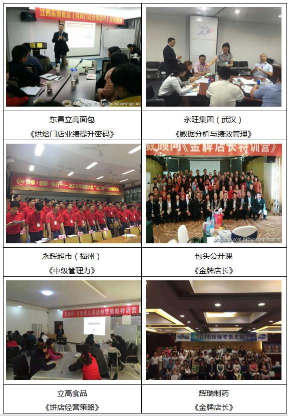 从2013年起,王山老师与广东立高食品有限公司合作,服务立高公司本部年会、各分公司的营销动员会、经销商大会、新品推荐会等。分别对立高公司员工、立高各地经销商、零售烘焙门店老板、店长等做了超过20天次培训。内容包括:《饼店业绩提升》、《O2O时代下饼店经营策略》