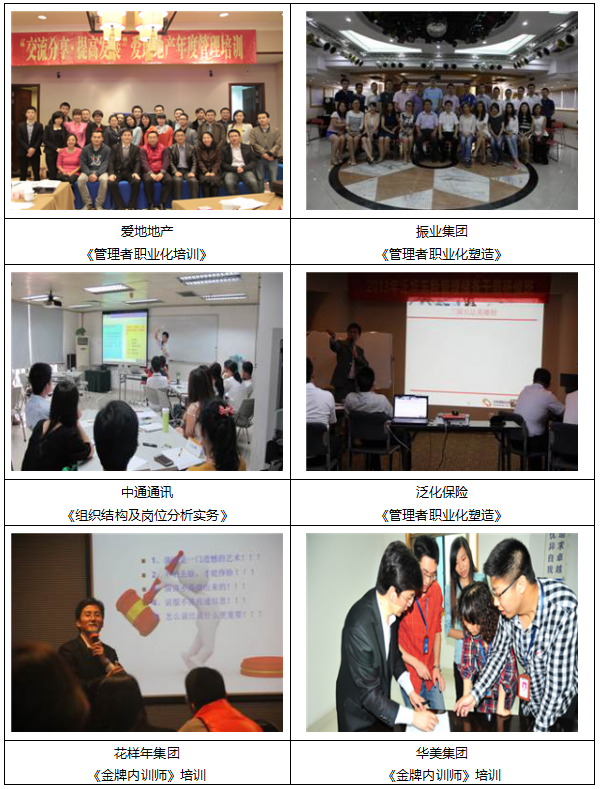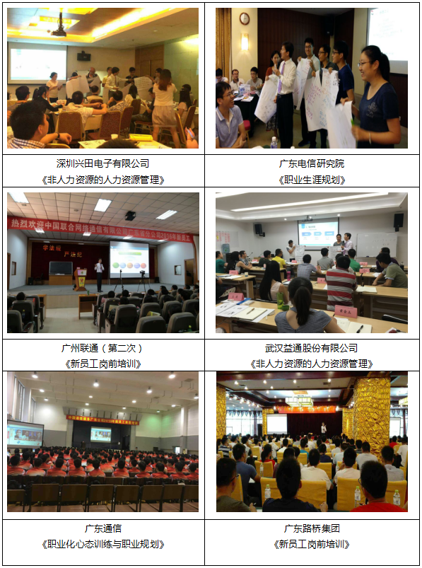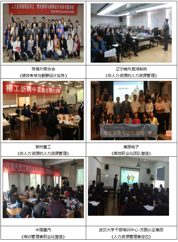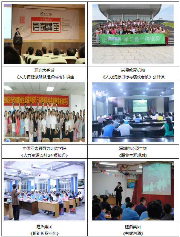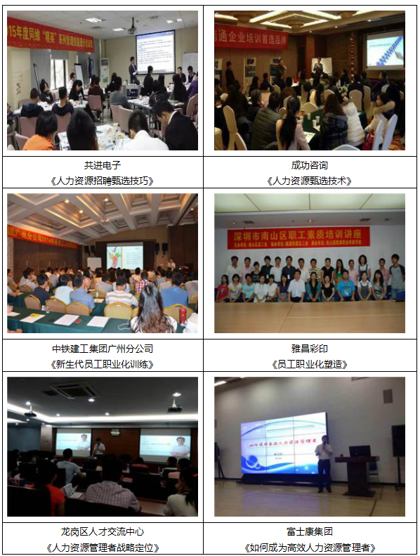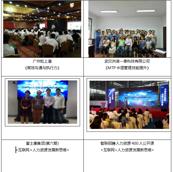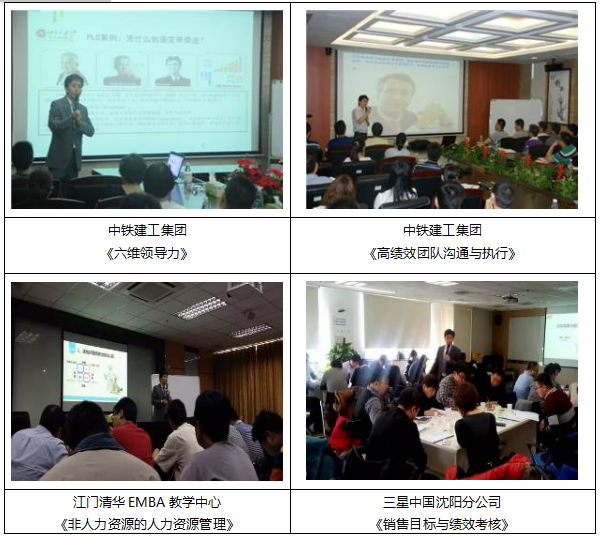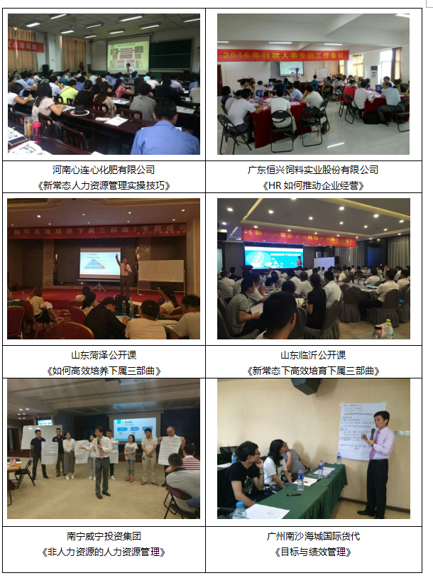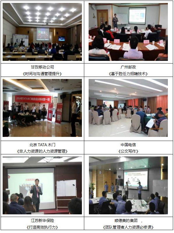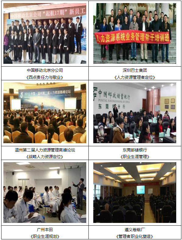 杨老师服务的客户遍布北京、天津、上海、深圳、广州、成都、南京、杭州、武汉、郑州、沈阳、哈尔滨、长春、长沙、西藏、兰州、银川、福州等地200以上企业,为中核工业集团、三星中国、中国移动、中国电信、中国联通、中铁建工集团、中国重汽、美的集团、中国邮政、中国邮储、中通通讯、中国建设银行、中国工商银行、中国农业银行、中信银行、柳工集团、阳光保险、华美集团、中通通讯、惠丰机电、建滔化工集团、金威啤酒集团、富士康集团、美的集团、巴士集团、重庆电工、遵义卷烟、共进电子、广州恒大集团、广州粒上皇食品、广西路桥集团、河南心连心化肥、南宁威宁投资集团、南沙海城货代、顺丰快递、广东省各地人才交流中心、清华大学国际MBA教学中心、武汉大学干部培训中心、华中科技大学MBA教学中心、华东理工大学培训中心、兰州大学研究生院、河北工业大学等多家高校EMBA班授课和多家大中型企事业单位进行中、高层领导加力与管理技能、人力资源管理技能及职业素养提升、阳光心态培训超500余场次。